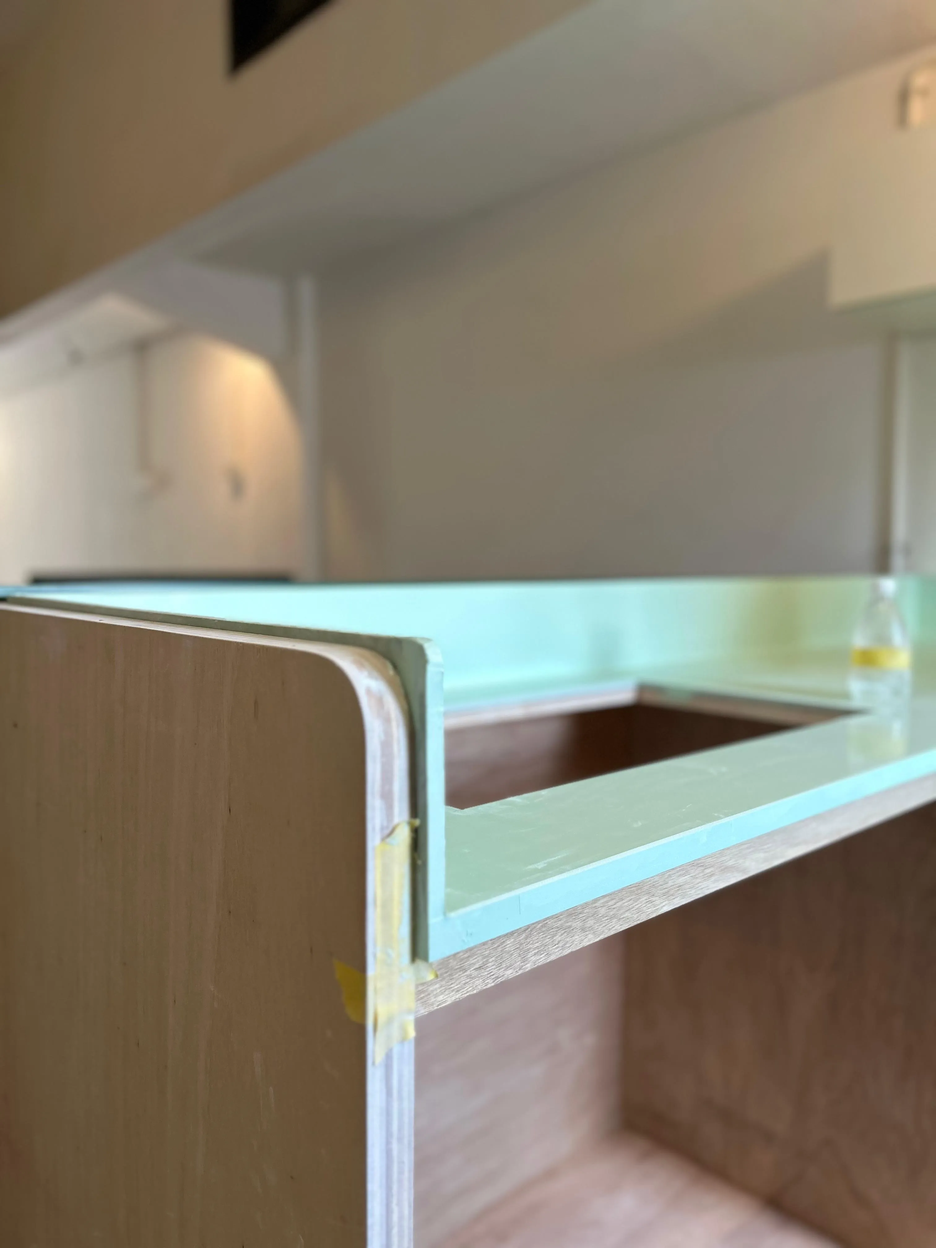 To make this space suitable for everyday living, we make simple kitchen set. It is topped by green colored solid surface slab, matching the accent color of the door of the sleeping bunker.