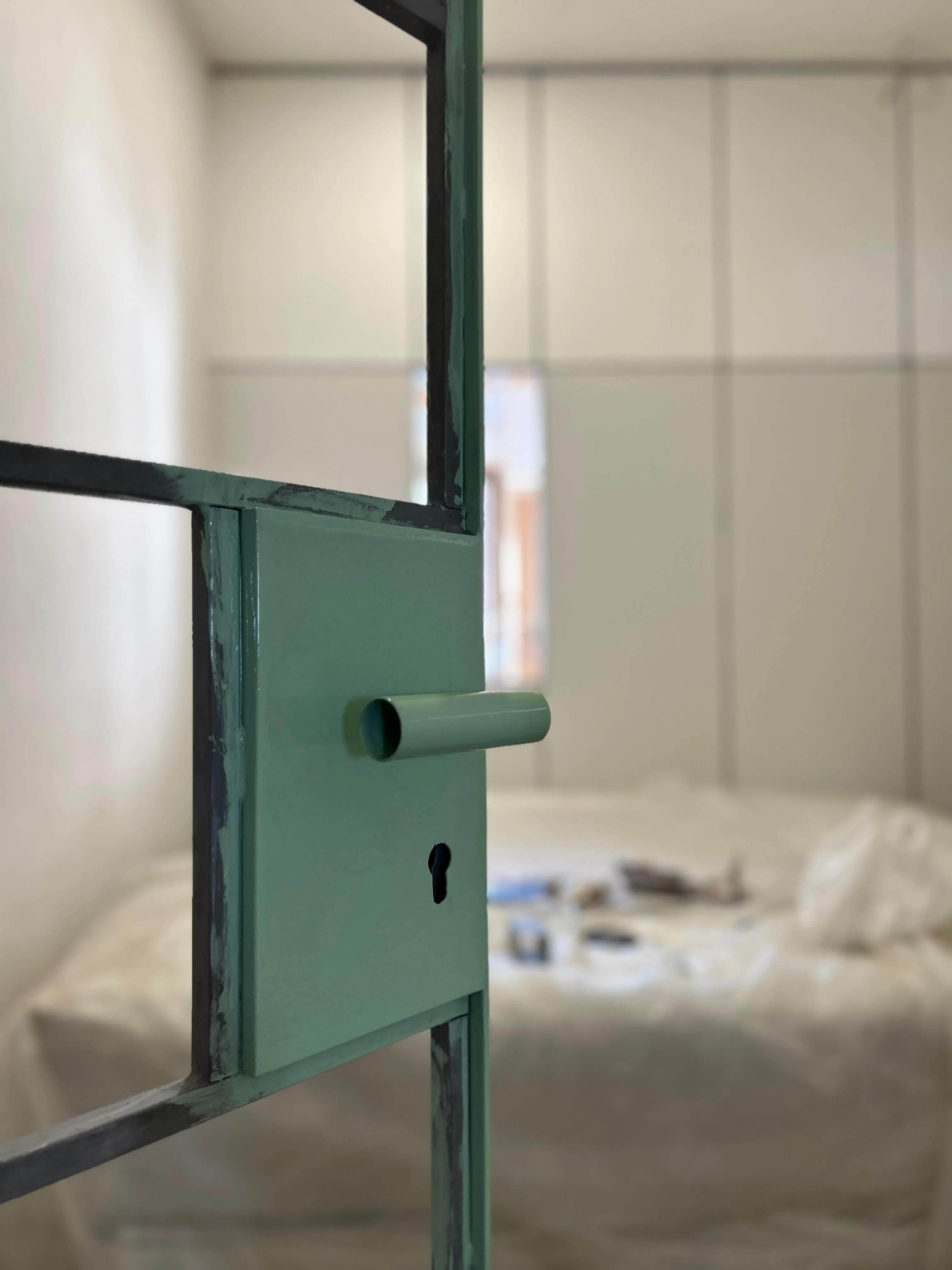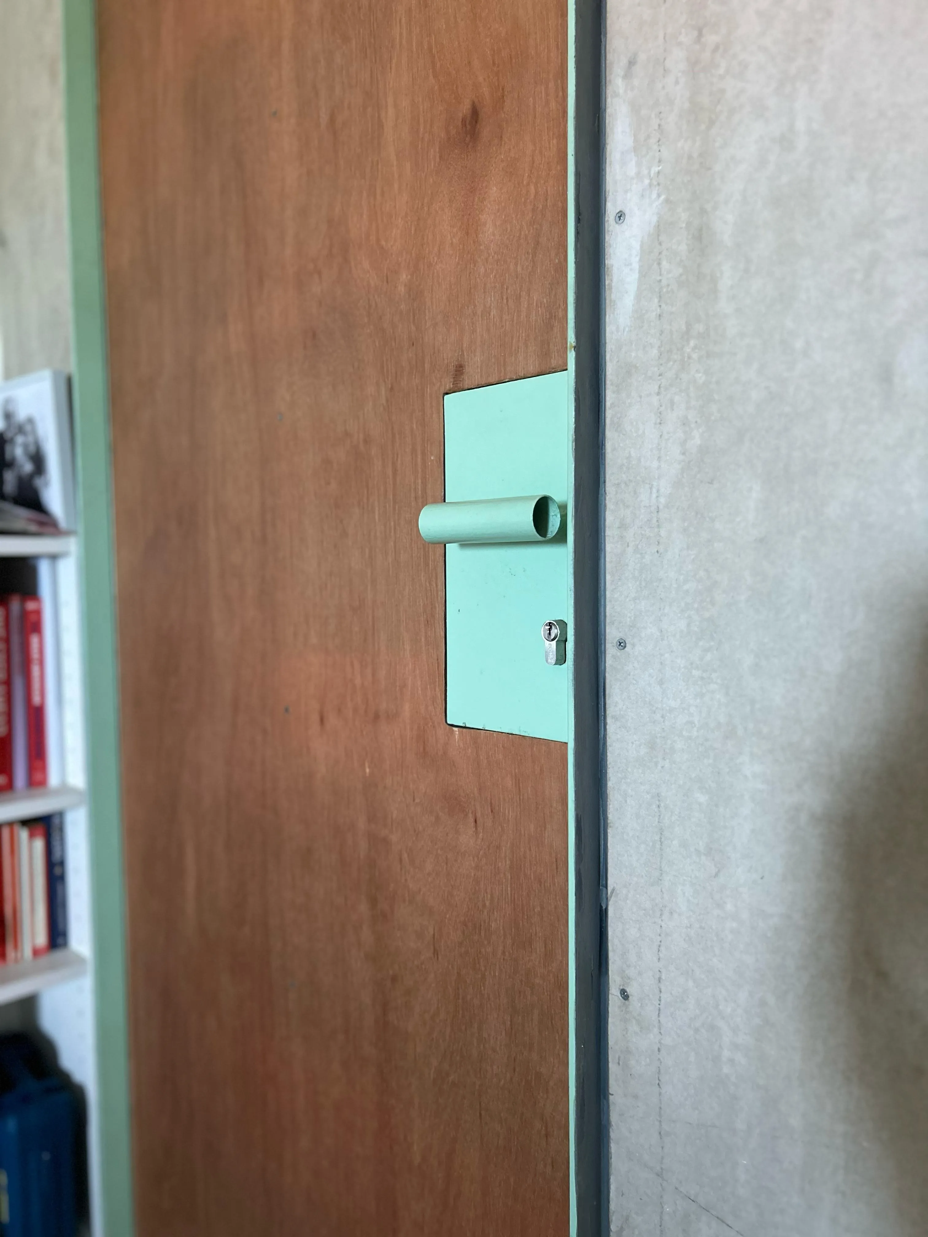 Because of the thickness of the wall which only reach 7cm, we also build custom door made by steel frame and high quality plywood covering. The handle is also made using steel pipe, we also have to make door stopper using 8mm strip metal which we think results in interesting sharp detail in the door area. We choose green color to counter raw tone of the silicate panel, this solid color works well with natural color of the plywood.