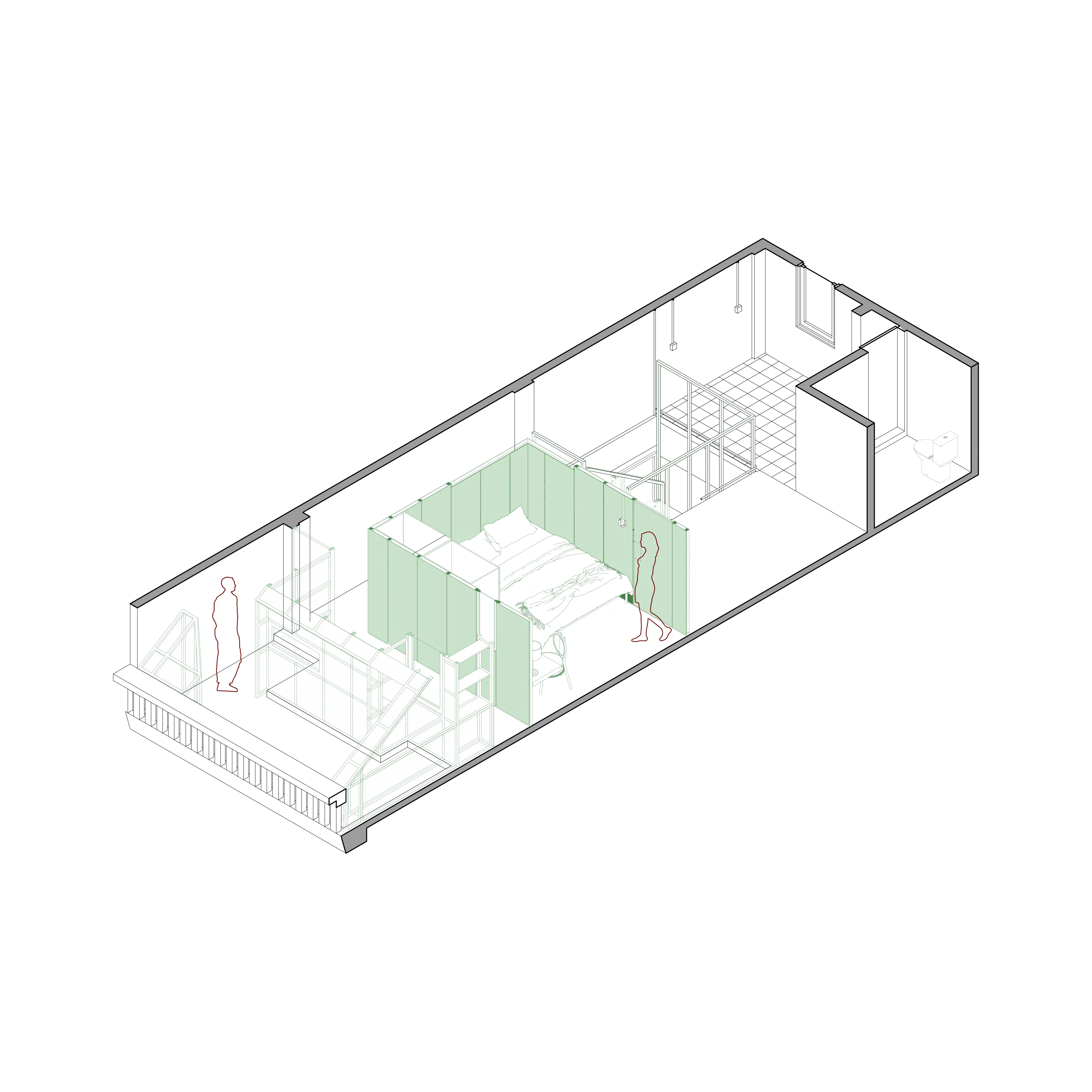 After some study we reached conclusion to build this sleeping box just behind the light facade we left some distance that later become laundry space, leveraging the glass house like quality that this space in-between can have.